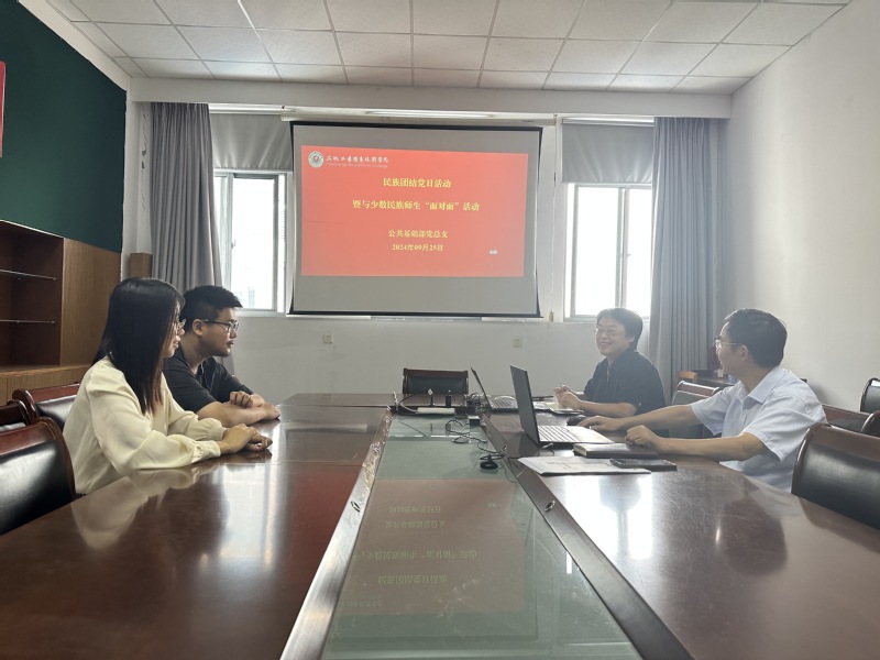 9月是民族团结进步宣传月,25日下午2时公共基础部党总支举办了“师生面对面 民族心连心”主题党日活动。党总支贾妍春副书记、王美红副主任、张巧珍班主任和回族学生蔡天奇同学一起参与交流活动。活动中,蔡天奇同学简要介绍了自己的家庭情况,高度肯定了我校教师认真负责的工作态度,详细说明了自己的学习情况,表达了对计算机编程的强烈兴趣。贾妍春给予热情鼓励,希望他能再接再厉,考取英语四六级证书,部门英语老师能够给予专业指导。王美红希望蔡天奇同学能够积极参与团体活动,提高人际交往能力,为日后进入社会做好铺垫。张巧珍也向学生表达了祝愿。此次活动,不仅是一次面对面地师生交流,更是旨在汉族老师密切联系少数民族学生,以小见大,为中华民族共同体建设添砖加瓦。
