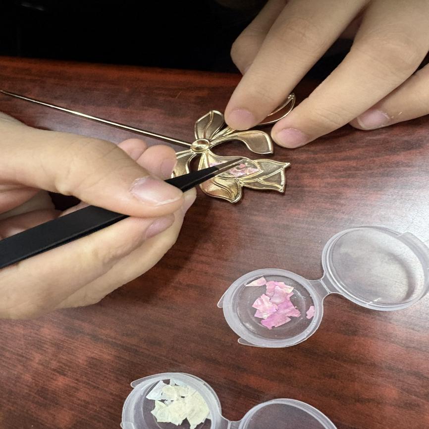社团指导教师王冉全程参与,与学生共同感受螺钿工艺的悠久历史与文化内涵。原本不起眼的贝壳碎片在大家的精心制作下变成熠熠生辉的饰品,方寸之间光华流转。