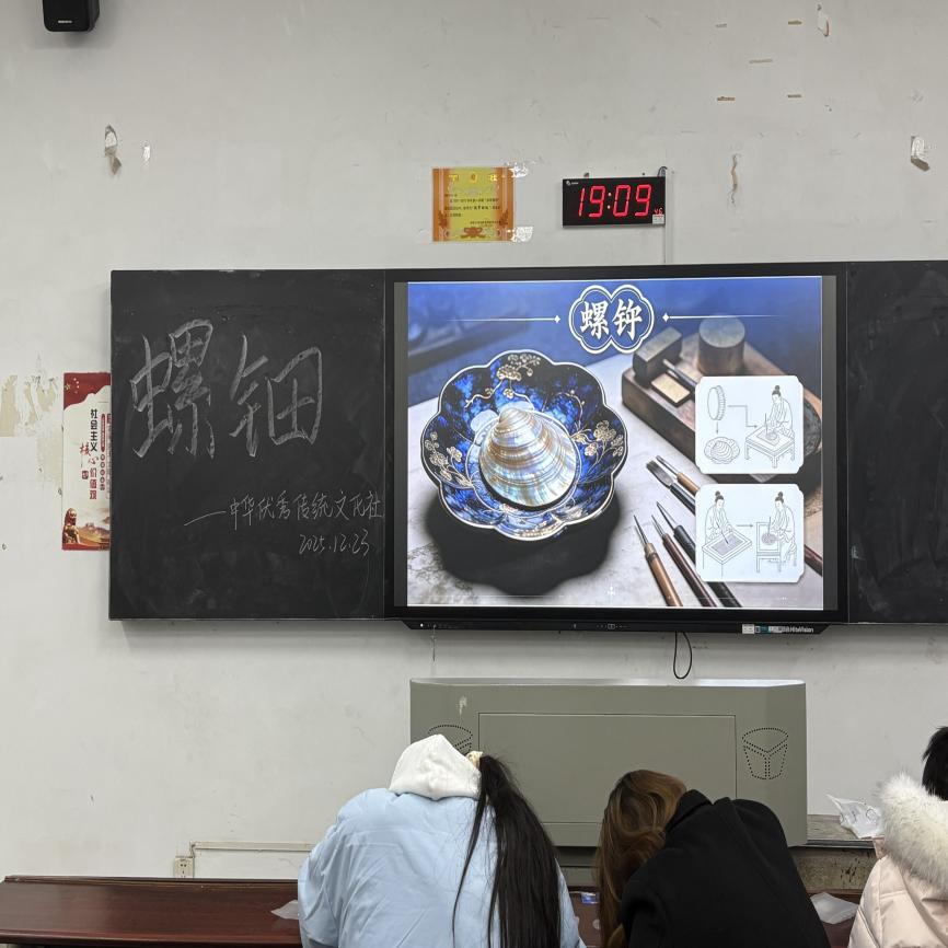 为传承中华传统工艺,提升学生美育素养,12月23日,公共基础部中华优秀传统文化交流社团在公共教学楼1102教室成功举办了“方寸之间的光华”螺钿主题活动,多名学生体验了这项古老而璀璨的非遗技艺。